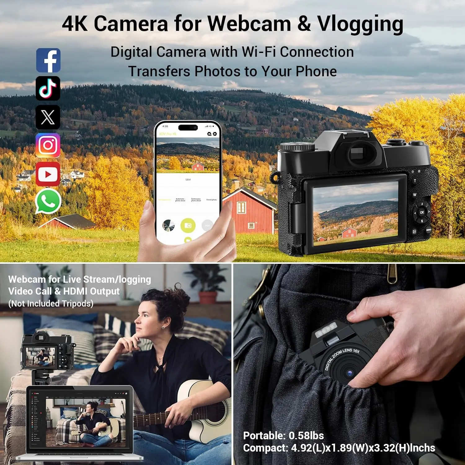 Webcam Function: 4K 30 FPS UHD Video Recording For Youtube Tiktok Streaming And Vlog Recording ( With merely a piece of USB Cable,the camera can be connected to your PC,and used as Youtube Facebook livestream webcam )