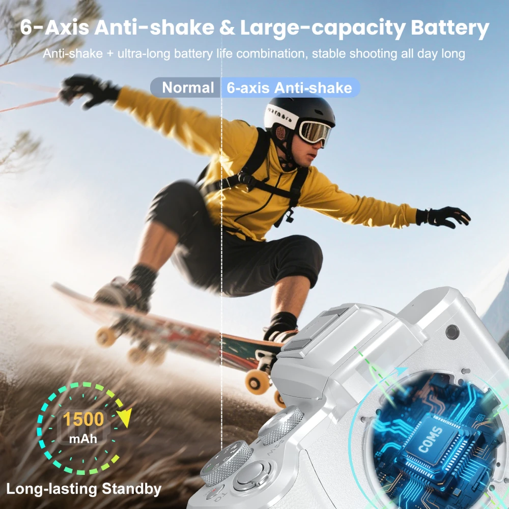 【6-AXIS ANTI-SHAKE & 1500MAH LARGE-CAPACITY BATTERY】Anti-shake + ultra-long battery life combination, stable shooting all day long. 6-axis electronic anti-shake effectively reduces the impact of hand shaking, and you can shoot while walking without blurring. 1500mAh large-capacity battery, a single charge can continuously shoot photos for 90 minutes or continuously record videos for 80 minutes.