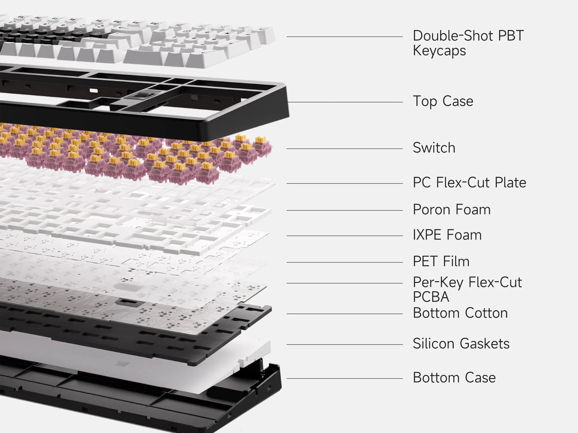 Smart touches make daily work smoother—like instant mute during meetings, precise volume control, or an enlarged 2U0 key that’s easier to press when typing fast. Every detail is right at your fingertips.Gasket Mount Structure