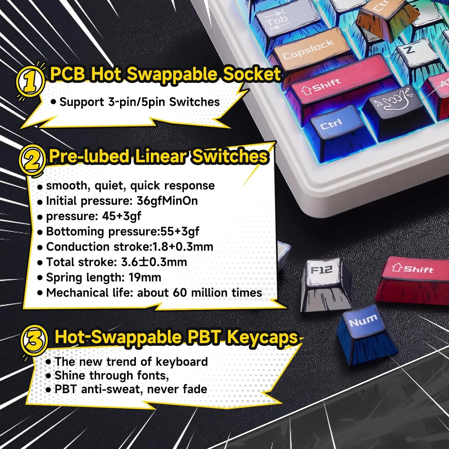 4. PBT comic keycaps take durability to a new level, ensuring durability and stylish design. These keycaps have durability and a stylish appearance